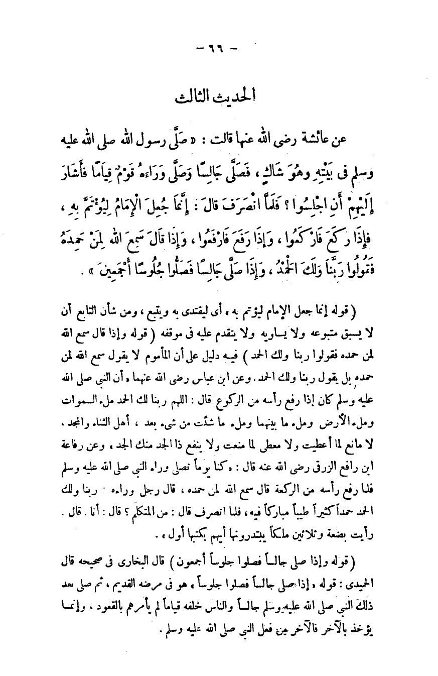 عن عائشة - رضي الله عنها - قالت: "صلى رسول الله - صلى الله عليه وسلم - في بيته وهو شاكٍ، فصلى جالسًا وصلى وراءه قوم قيامًا فأشار إليهم أن اجلسوا؟ فلمَّا انصرف قال: ((إنما جُعِل الإمام ليُؤتَمَّ به، فإذا ركع فاركعوا، وإذا رفع فارفعوا، وإذا قال: سمع الله لِمَن حمده فقولوا: ربنا ولك الحمد، وإذا صلى جالسًا فصلوا جلوسًا أجمعين)) .
