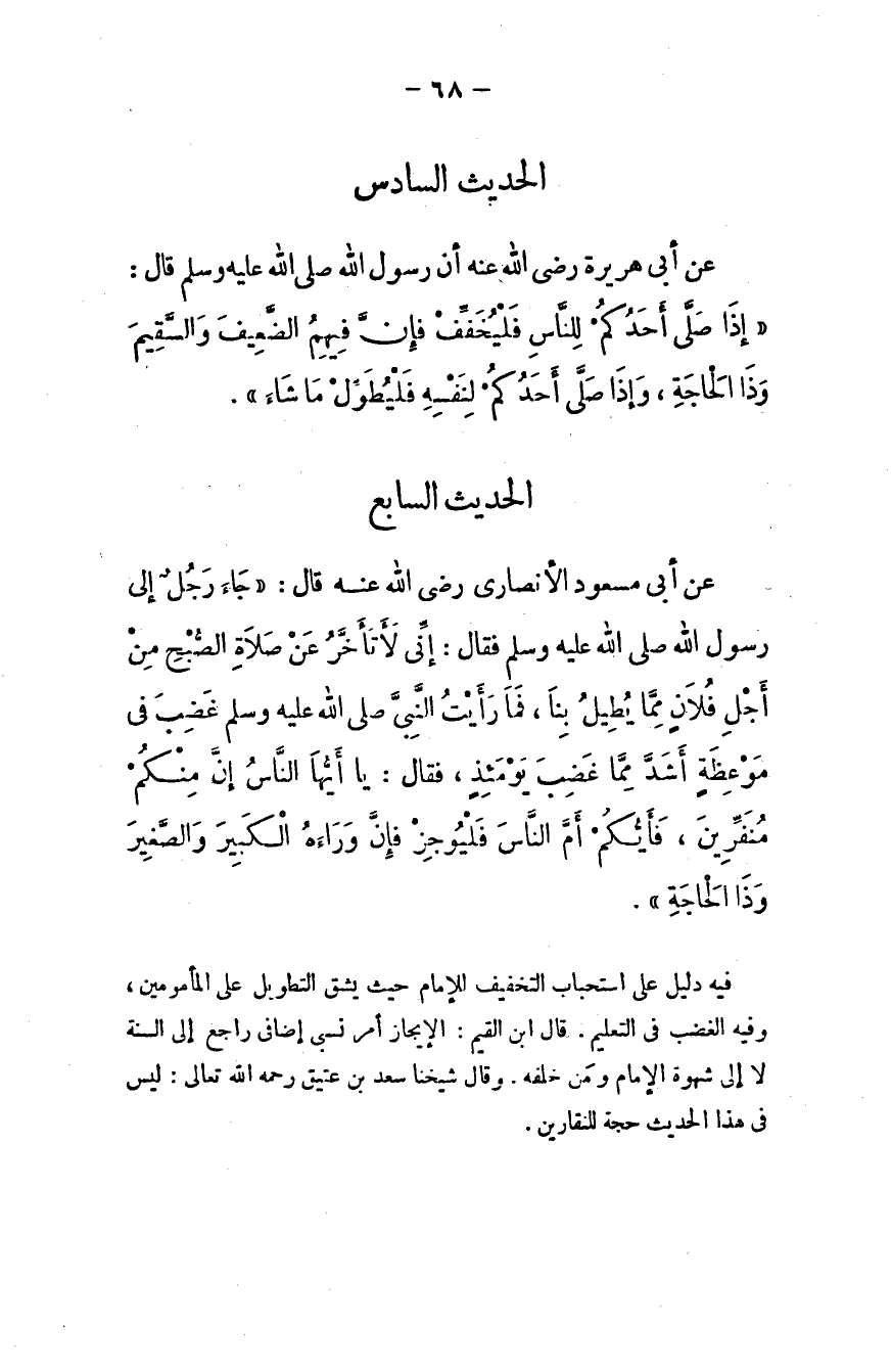 عن أبي مسعود الأنصاري - رضي الله عنه - قال: جاء رجل إلى رسول الله - صلى الله عليه وسلم - فقال: إني لأتأخر عن صلاة الصبح من أجل فلان مما يطيل بنا، فما رأيت النبي - صلى الله عليه وسلم - غضب في موعظة أشد مما غضب يومئذ، فقال: ((يا أيها الناس، إن منكم منفِّرين، فأيكم أمَّ الناس فليوجز؛ فإن وراءه الكبير والصغير وذا الحاجة)) .