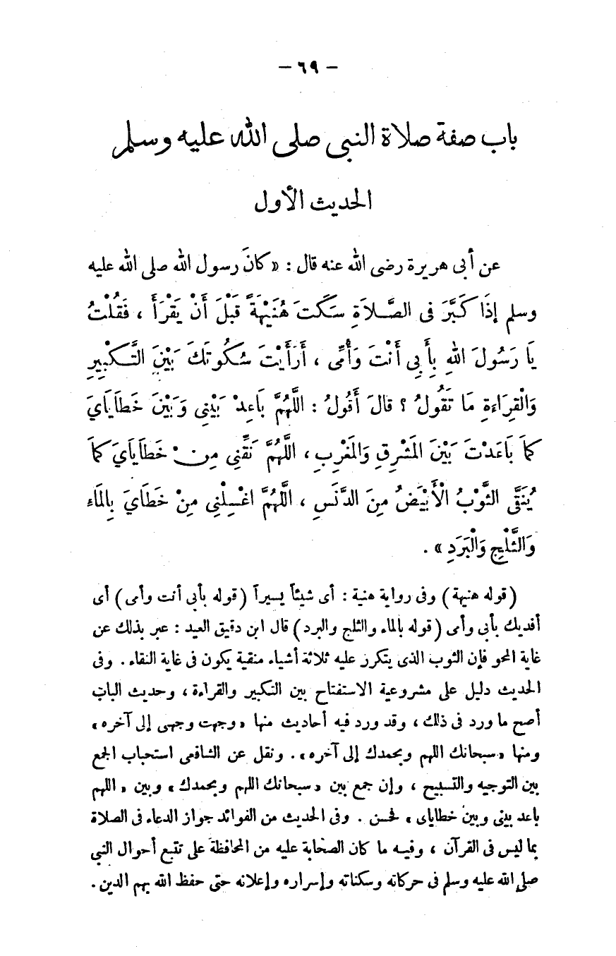 عن أبي هريرة - رضي الله عنه - قال: كان رسول الله - صلى الله عليه وسلم - إذا كبَّر في الصلاة سكت هنيهة قبل أن يقرأ، فقلت: يا رسول الله، بأبي أنت وأمي، أرأيت سكوتك بين التكبير والقراءة ما تقول؟ قال: ((أقول: اللهم باعد بين وبين خطاياي كما باعدت بين المشرق والمغرب، اللهم نقِّني من خطاياي كما ينقَّى الثوب الأبيض من الدنس، اللهم اغسلني من خطاي بالماء والثلج والبرد)) .