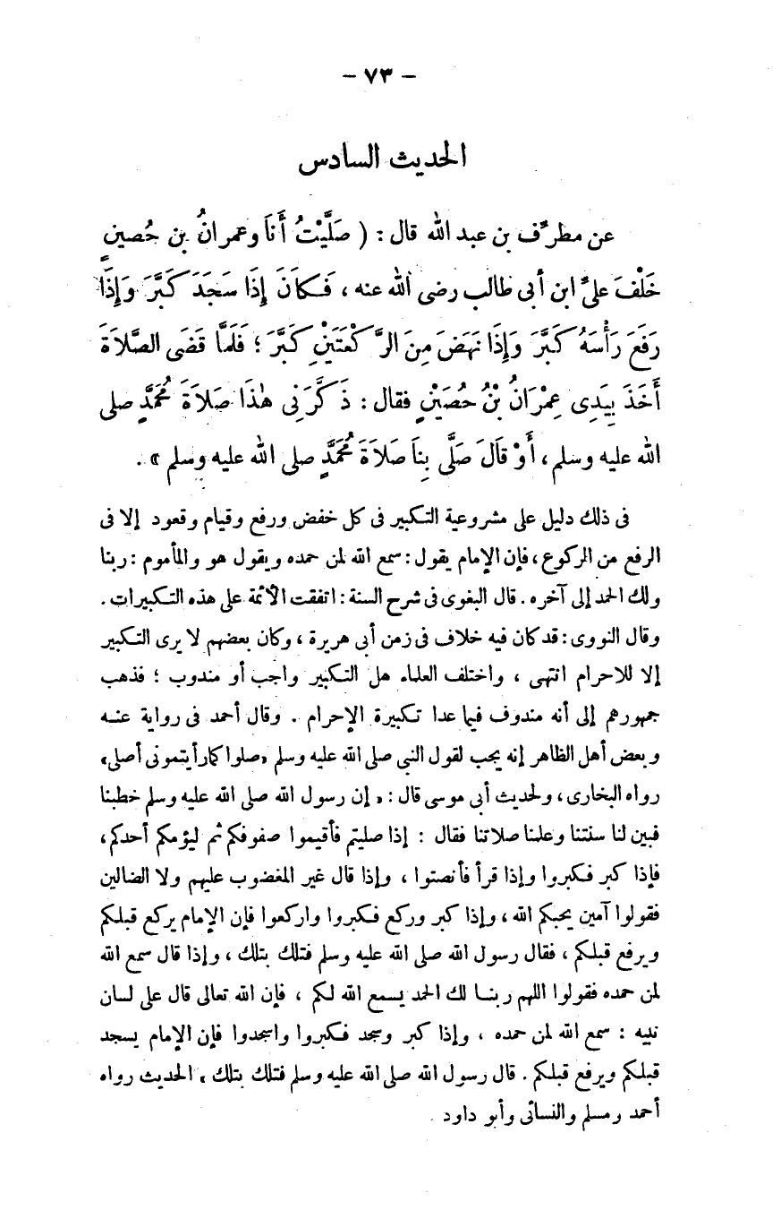 عن مطرف بن عبد الله قال: صليت أنا وعمران بن حصين خلف علي بن أبي طالب - رضي الله عنه - فكان إذا سجد كبَّر، وإذا رفع رأسه كبَّر، وإذا نهض من الركعتين كبَّر، فلمَّا قضى الصلاة أخذ بيدي عمران بن حصين فقال: ذكَّرَني هذا صلاة محمد - صلى الله عليه وسلم - أو قال: صلى بنا صلاة محمد - صلَّى الله عليه وسلَّم.