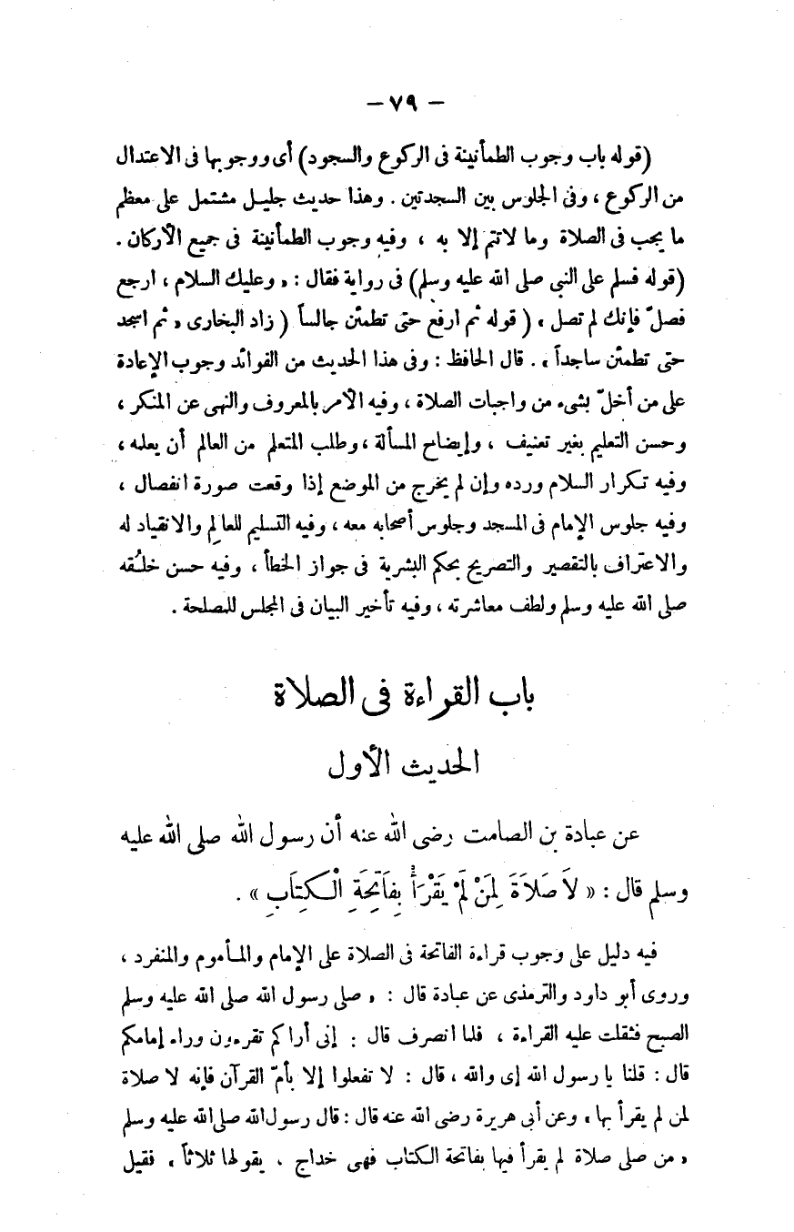 عن عبادة بن الصامت - رضي الله عنه - أن رسول الله - صلى الله عليه وسلم - قال: ((لا صلاة لِمَن يقرأ بفاتحة الكتاب)) .