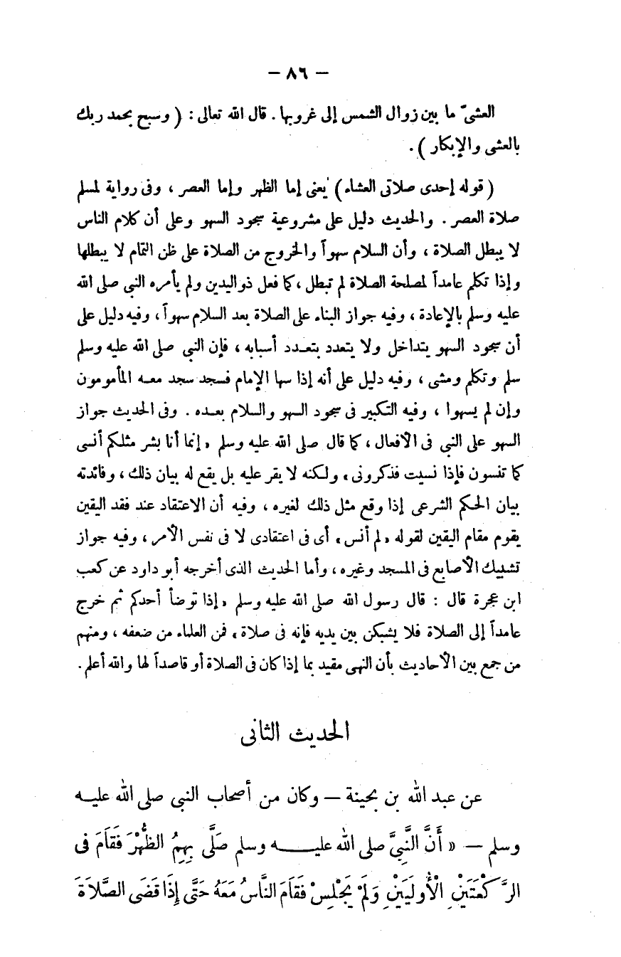 عن عبد الله بن بحينة - وكان من أصحاب النبي، - صلى الله عليه وسلم - أن النبي - صلى الله عليه وسلم - صلى الظهر فقام في الركعتين الأوليَين ولم يجلس، فقام الناس معه حتى إذا قضى الصلاة