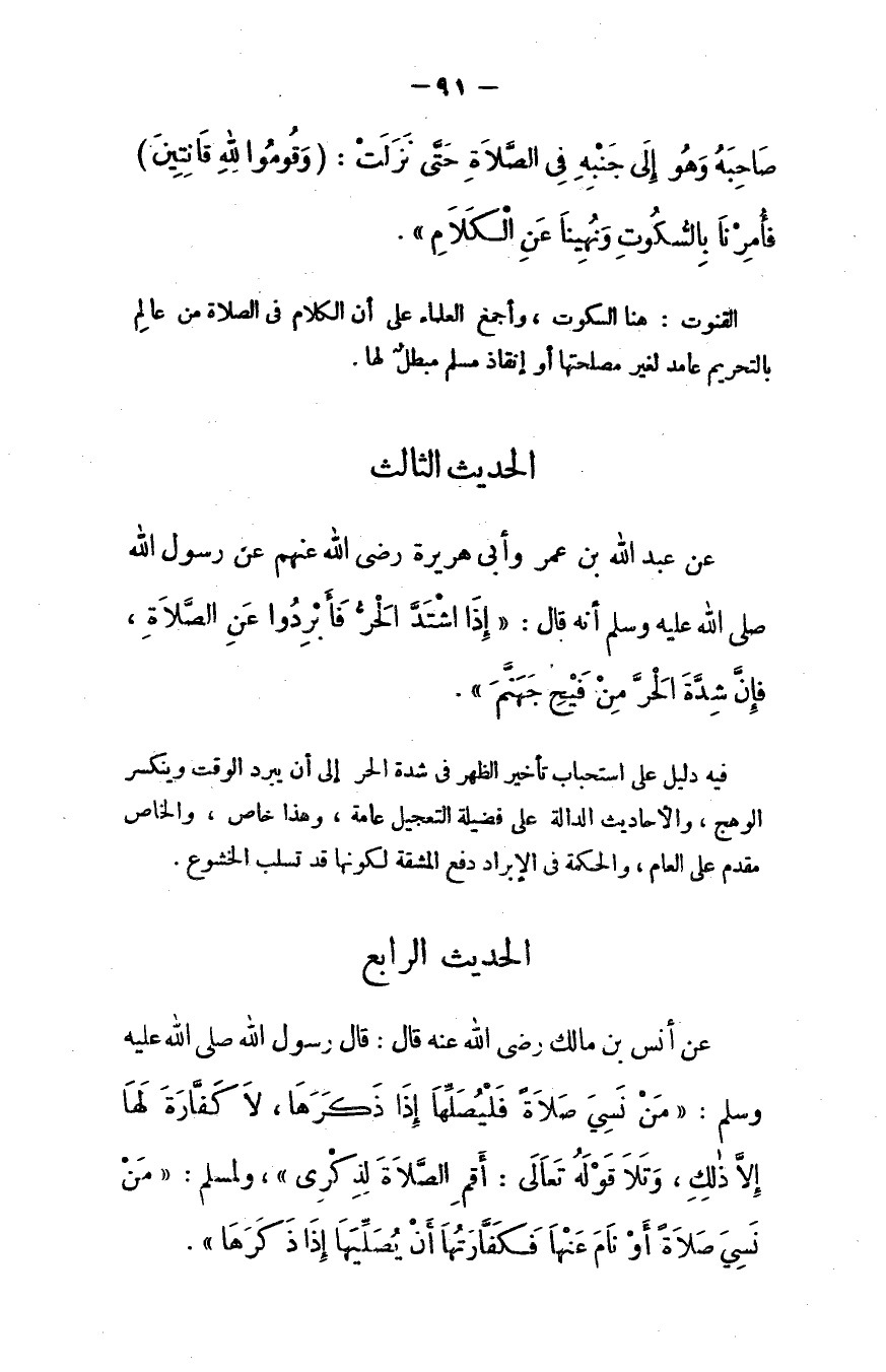 (القنوت) : هنا السكوت، وأجمع العلماء على أن الكلام في الصلاة من عالم بالتحريم عامد لغير مصلحتها أو إنقاذ مسلم مُبطِل لها.