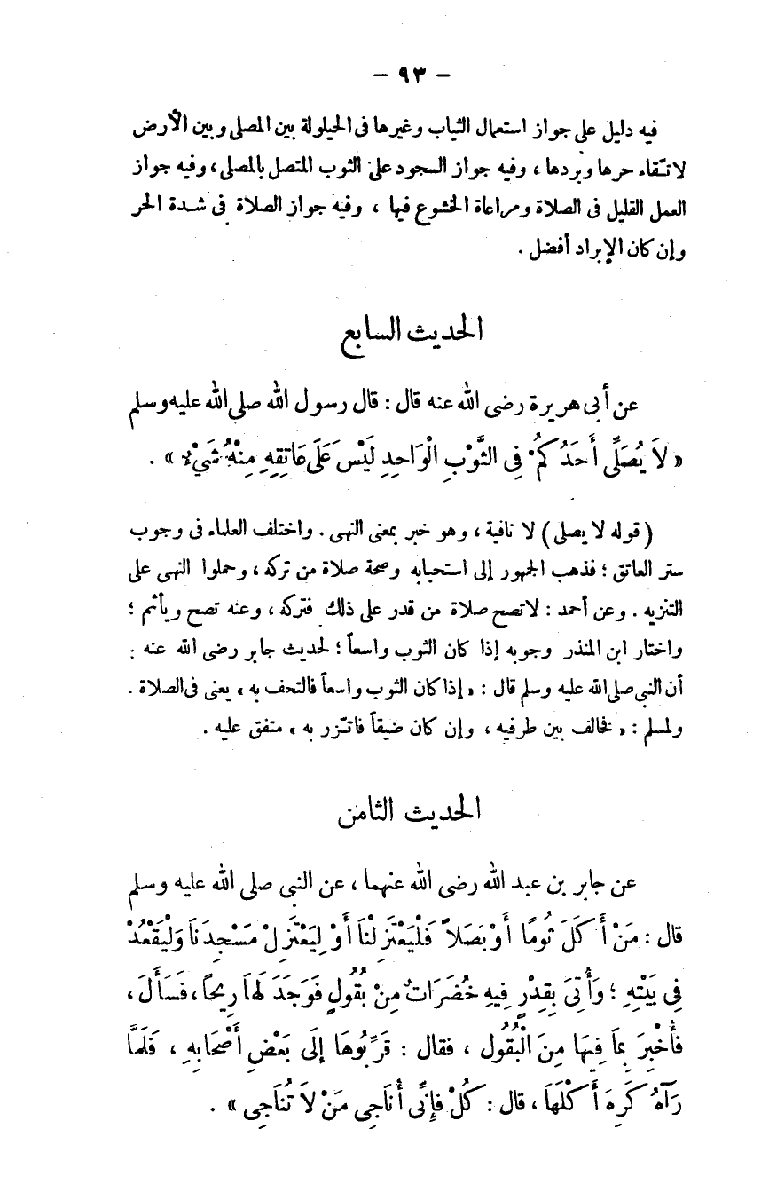 عن أبي هريرة - رضي الله عنه - قال: قال رسول الله - صلى الله عليه وسلم - ((لا يصلي أحدكم في الثوب الواحد ليس على عاتقه منه شيء)) .