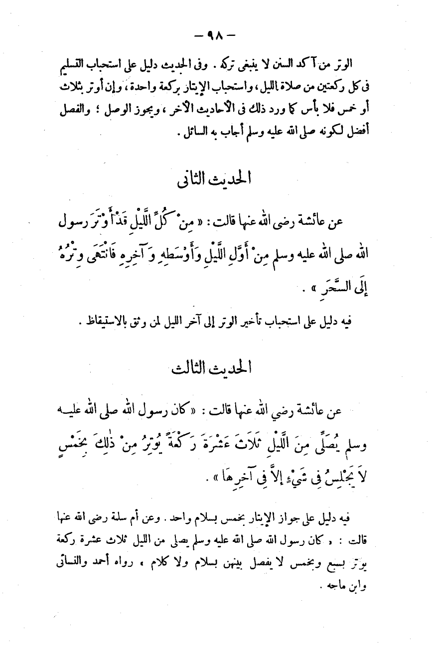 وعن أم سلمة - رضي الله عنها - قالت: "كان رسول الله - صلى الله عليه وسلم - يصلي من الليل ثلاث عشرة ركعة يوتر بسبع وبخمس، لا يفصل بينهن بسلام ولا كلام)) ؛ رواه أحمد والنسائي وابن ماجه.