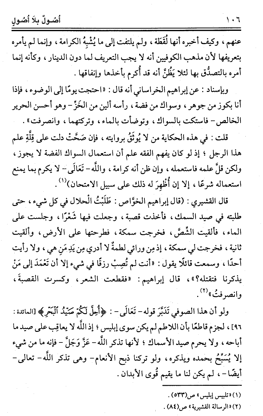 قال القشيري: (قال إبراهيم الخوَّاص: طَلَبْتُ الْحلال في كل شيء، حتى طلبته في صيد السمك، فأخذت قصبة، وجعلت فيها شَعْرًا، وجلست على الماء، فألقيت الشِّصَّ، فخرجت سمكة، فطرحتها على الأرض، وألقيت ثانية، فخرجت لي سمكة، إذ مِن ورائي لطمة لا أدري مِن يَدِ مَنِ هي، ولا رأيت أحدًا، وسمعت قائلًا يقول: "أنت لم تُصِبْ رزقًا في شيء إلا أن تَعْمَدَ إلى مَنْ يذكرنا فتقتله؟ "، قال إبراهيم: "فقطعت الشعر، وكسرت القصبةَ، وانصرفت" (¬2).