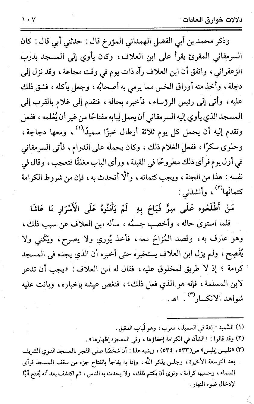 وذكر محمد بن أبي الفضل الهمداني المؤرخ قال: حدثني أبي قال: كان السرمقاني المقرئ يقرأ على ابن العلاف، وكان يأوي إلى المسجد بدرب الزعفراني، واتفق أن ابن العلاف رآه ذات يوم في وقت مجاعة، وقد نزل إلى دجلة، وأخذ منه أوراق الخس مما يرمي به أصحابُه، وجعل يأكله، فشق ذلك عليه، وأتى إلى رئيس الرؤساء، فأخبره بحاله، فتقدم إلى غلام بالقرب إلى المسجد الذي يأوي إليه السرمقاني أن يعمل لِبابه مفتاحًا من غير أن يُعْلمه، ففعل وتقدم إليه أن يحمل كل يوم ثلاثة أرطال خبزًا سميدًا (¬1)، ومعها دجاجة، وحلوى سكرًا، ففعل الغلام ذلك، وكان يحمله على الدوام، فأتى السرمقاني في أول يوم فرأى ذلك مطروحًا في القبلة، ورأى الباب مغلقًا فتعجب، وقال في نفسه: هذا من الجنة، ويجب كتمانه، وألَّا أتحدث به، فإن من شروط الكرامة كتمانَها (¬2)، وأنشدني: