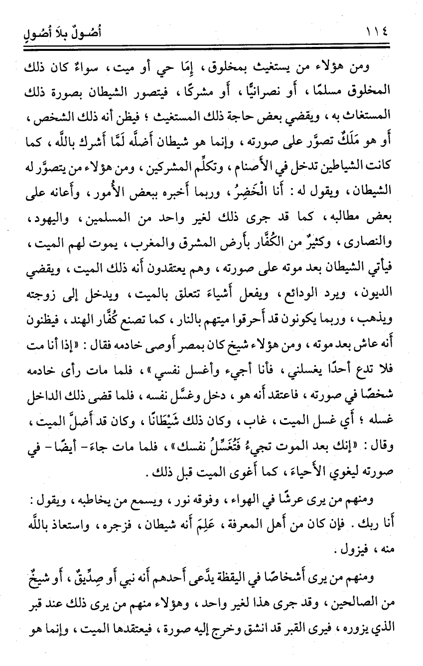 ومن هؤلاء من يستغيث بمخلوق، إِمَا حي أو ميت، سواءٌ كان ذلك المخلوق مسلمًا، أَو نصرانيًّا، أَو مشركًا، فيتصور الشيطان بصورة ذلك المستغاث به، ويقضي بعض حاجة ذلك المستغيث؛ فيظن أنه ذلك الشخص، أَو هو مَلَكٌ تصوَّر على صورته، وانما هو شيطان أَضلَّه لَما أَشرك باللَّه، كما كانت الشياطين تدخل في الأَصنام، وتكلِّم المشركين، ومن هؤلاء من يتصوَّر له الشيطان، ويقول له: أَنا الْخَضِرُ، وربما أَخبره ببعض الأُمور، وأَعانه على بعض مطالبه، كما قد جرى ذلك لغير واحد من المسلمين، واليهود، والنصارى، وكثيرٌ من الكُفَّار بأَرض المشرق والمغرب، يموت لهم الميت، فيأتي الشيطان بعد موته على صورته، وهم يعتقدون أَنه ذلك الميت، ويقضي الديون، ويرد الودائع، ويفعل أَشياءَ تتعلق بالميت، ويدخل إلى زوجته ويذهب، وربما يكونون قد أَحرقوا ميتهم بالنار، كما تصنع كُفَّار الهند، فيظنون أَنه عاش بعد موته، ومن هؤلاء شيخ كان بمصر أَوصى خادمه فقال: "إذا أنا مت فلا تدع أحدًا يغسلني، فأنا أجيء وأغسل نفسي"، فلما مات رأى خادمه شخصًا في صورته، فاعتقد أَنه هو، دخل وغسل نفسه، فلما قضى ذلك الداخل غسله؛ أَي غسل الميت، غاب، وكان ذلك شَيْطَانًا، وكان قد أَضلَّ الميت، وقال: "إنك بعد الموت تجيءُ فَتُغَسِّلُ نفسك"، فلما مات جاءَ -أيضًا- في صورته ليغوي الأحياءَ، كما أَغوى الميت قبل ذلك.