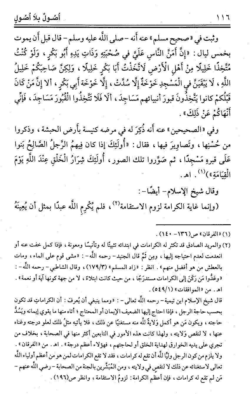 (¬2) والمريد الصادق قد تكثر له الكرامات في ابتدائه تثبيتًا له وتأنيسًا ومعونة، فإذا كمل خفت عنه أو انعدمت لعدم احتياجه إليها، ومِن ثَمَّ قال الجنيد -رحمه الله-: "مشى قوم على الماء، ومات بالعطش من هو أفضل منهم". انظر: "زاد المسلم" (3/ 179)، وقال الشاطبي -رحمه الله-: "وعَدُّوا مَن رَكَنَ إلى الكرامات مستدرَجًا، من حيث كانت ابتلاءً، لا من جهة كونها آية أو نعمة". اهـ. من "الموافقات" (1/ 549).