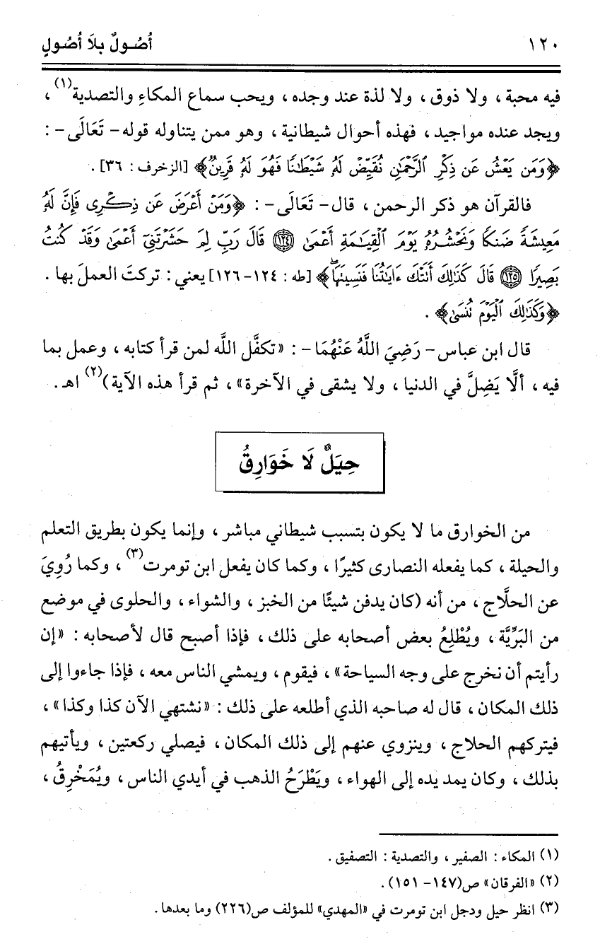 من الخوارق ما لا يكون بتسبب شيطاني مباشر، وإنما يكون بطريق التعلم والحيلة، كما يفعله النصارى كثيرًا، وكما كان يفعل ابن تومرت (¬3)، وكما رُوِيَ عن الحلَّاج، من أنه (كان يدفن شيئًا من الخبز، والشواء، والحلوى في موضع من البَرِّيَّة، ويُطْلِعُ بعض أصحابه على ذلك، فإذا أصبح قال لأصحابه: "إن رأيتم أن نخرج على وجه السياحة"، فيقوم، ويمشي الناس معه، فإذا جاءوا إلى ذلك المكان، قال له صاحبه الذي أطلعه على ذلك: "نشتهي الآن كذا وكذا"، فيتركهم الحلاج، وينزوي عنهم إلى ذلك المكان، فيصلي ركعتين، ويأتيهم بذلك، وكان يمد يده إلى الهواء، ويَطْرَحُ الذهب في أيدي الناس، ويُمَخْرِقُ،