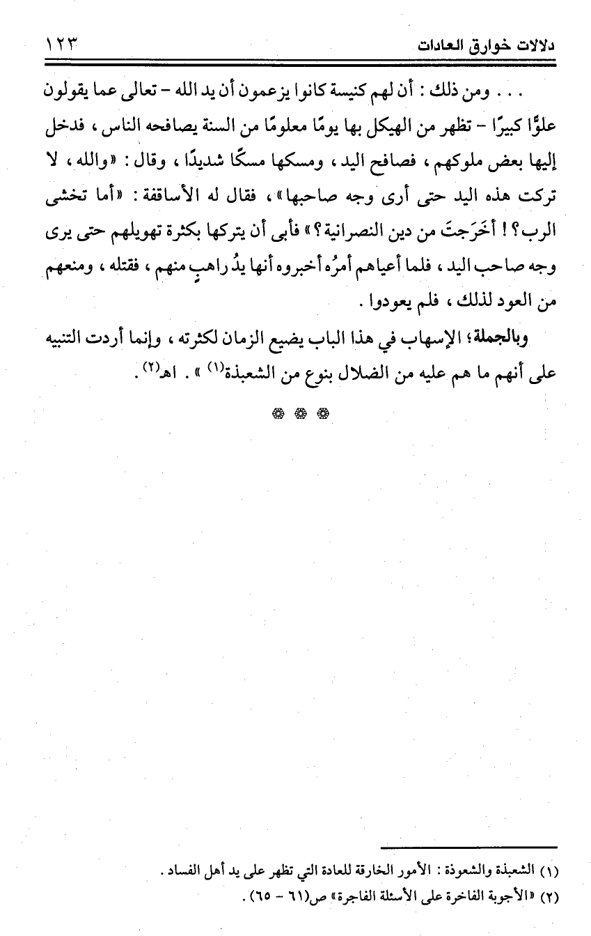 وبالجملة؛ الإسهاب في هذا الباب يضيع الزمان لكثرته، وإنما أردت التنبيه على أنهم ما هم عليه من الضلال بنوع من الشعبذة (¬1) ". اهـ (¬2).