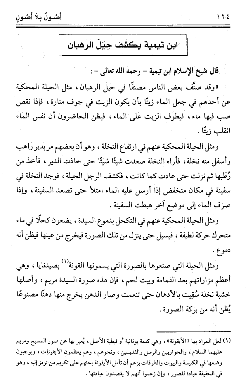 (¬1) لعل المراد بها "الأيقونة"، وهي كلمة يونانية أو قبطية الأصل، يُعبر بها عن صور المسيح ومريم عليهما السلام، والحواريين والرسل والقديسين، ونحوهم، وهم يعظمون الأيقونات، ويوجبون وضعها في الكنيسة والبيوت والطرقات بزعم أن تأمل الأيقونة يحثهم على تكريم من ترمز إليه، وهو في الحقيقة عبادة للصور، وإن زعموا أنهم لا يقصدون عبادتها.