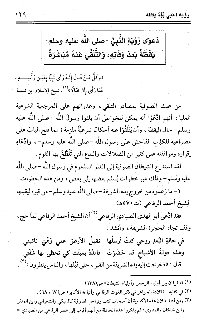 دَعوَى رُؤيَةِ النَّبِيِّ -صلى الله عليه وسلم- يَقَظَةً بَعدَ وَفَاتِهِ، وَالتَّلَقِّي عَنهُ مُبَاشَرَةً