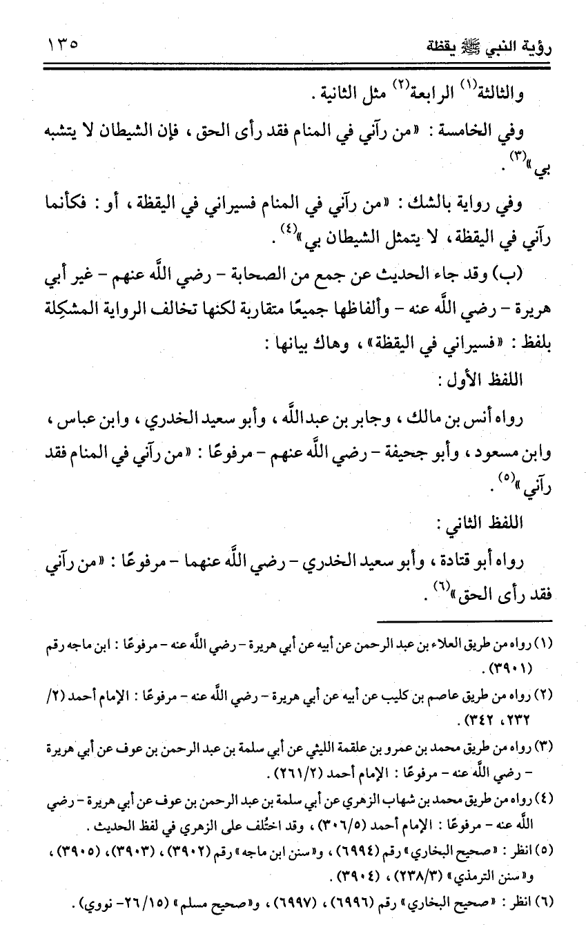 رواه أنس بن مالك، وجابر بن عبد اللَّه، وأبو سعيد الخدري، وابن عباس، وابن مسعود، وأبو جحيفة -رضي اللَّه عنهم- مرفوعًا: "من رآني في المنام فقد رآني" (¬5).