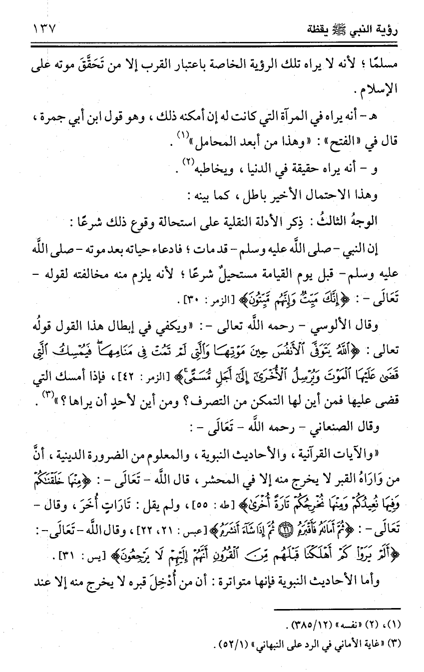 "والآيات القرآنية، والأحاديث النبوية، والمعلوم من الضرورة الدينية، أنَّ من وَارَاهُ القبر لا يخرج منه إلا في المحشر، قال اللَّه -تَعَالَى-: {مِنْهَا خَلَقْنَاكُمْ وَفِيهَا نُعِيدُكُمْ وَمِنْهَا نُخْرِجُكُمْ تَارَةً أُخْرَى} [طه: 55]، ولم يقل: تَارَاتٍ أُخَرَ، وقال -تَعَالَى-: {ثُمَّ أَمَاتَهُ فَأَقْبَرَهُ (21) ثُمَّ إِذَا شَاءَ أَنْشَرَهُ (22)} [عبس: 21، 22]، وقال الله -تَعَالَى-: {أَلَمْ يَرَوْا كَمْ أَهْلَكْنَا قَبْلَهُمْ مِنَ الْقُرُونِ أَنَّهُمْ إِلَيْهِمْ لَا يَرْجِعُونَ} [يس: 31].