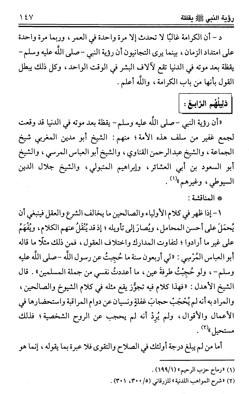 "أن رؤية النبي -صلى اللَّه عليه وسلم- يقظة بعد موته في الدنيا قد وقعت لجمع غفير من سلف هذه الأمة؛ منهم: الشيخ أبو مدين المغربي شيخ الجماعة، والشيخ عبد الرحمن القناوي، والشيخ أبو العباس المرسي، والشيخ أبو السعود بن أبي العشائر، وإبراهيم المتبولي، والشيخ جلال الدين السيوطي، وغيرهم" (¬1).