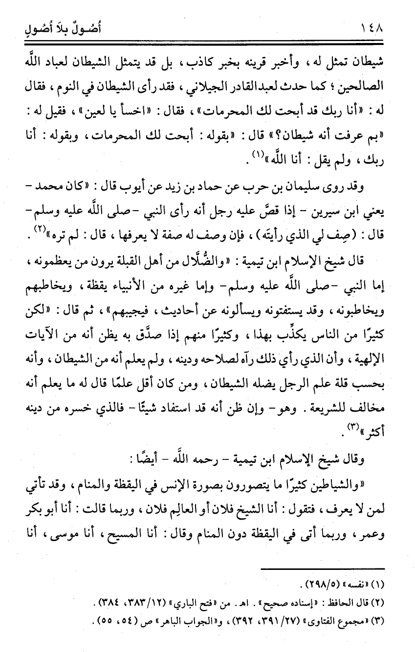 "والشياطين كثيرًا ما يتصورون بصورة الإنس في اليقظة والمنام، وقد تأتي لمن لا يعرف، فتقول: أنا الشيخ فلان أو العالِم فلان، وربما قالت: أنا أبو بكر وعمر، وربما أتى في اليقظة دون المنام وقال: أنا المسيح، أنا موسى، أنا