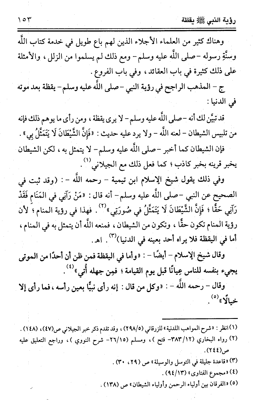 قد تبيَّن لك أنه -صلى اللَّه عليه وسلم- لا يرى يقظة، ومن رأى ما يوهم ذلك فإنه من تلبيس الشيطان -لعنه اللَّه- ولا يرد عليه حديث: "فَإِنَّ الشَّيْطَانَ لَا يَتَمَثَّلُ بِي".