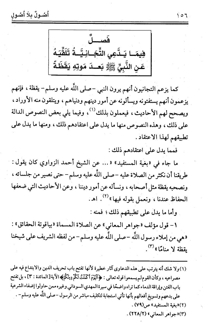 فَصلٌ فِيمَا يَدَّعِي التِّجَانِيَّةُ تَلَقِّيَهُ عَنِ النَّبِيِّ -صلى الله عليه وسلم- بَعدَ مَوتِهِ يَقَظَةً