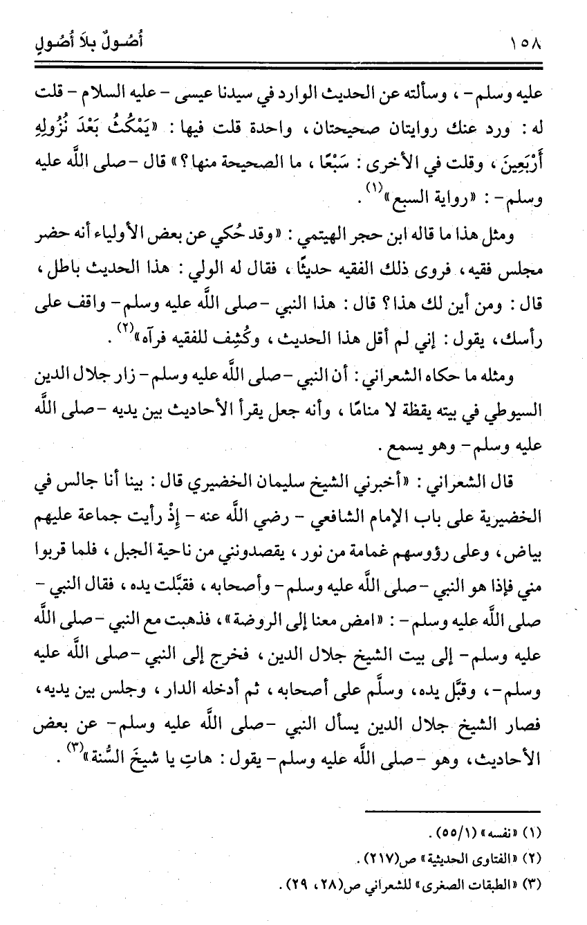 ومثله ما حكاه الشعراني: أن النبي -صلى اللَّه عليه وسلم- زار جلال الدين السيوطي في بيته يقظة لا منامًا، وأنه جعل يقرأ الأحاديث بين يديه -صلى اللَّه عليه وسلم- وهو يسمع.
