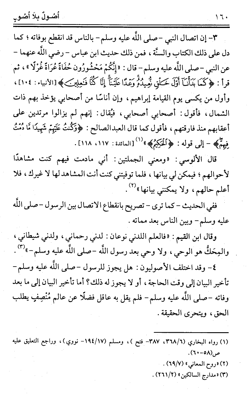 3 - إن اتصال النبي -صلى اللَّه عليه وسلم- بالناس قد انقطع بوفاته؛ كما دل على ذلك الكتاب والسنَّة، فمن ذلك حديث ابن عباس -رضي اللَّه عنهما- عن النبي -صلى اللَّه عليه وسلم- قال: "إِنَّكُمْ مَحْشُورُون حُفَاةً عُرَاةً غُرْلًا"، ثم قرأ: {كَمَا بَدَأْنَا أَوَّلَ خَلْقٍ نُعِيدُهُ وَعْدًا عَلَيْنَا إِنَّا كُنَّا فَاعِلِينَ} [الأنبياء: 104]، وأول من يكسى يوم القيامة إبراهيم، وإن أناسًا من أصحابي يؤخذ بهم ذات الشمال، فأقول: أصحابي أصحابي، فيُقال: إنهم لم يزالوا مرتدين على أعقابهم منذ فارقتهم، فأقول كما قال العبد الصالح: {وَكُنْتُ عَلَيْهِمْ شَهِيدًا مَا دُمْتُ فِيهِمْ} - إلى قوله {الْحَكِيمُ} " (¬1) [المائدة: 117، 118].