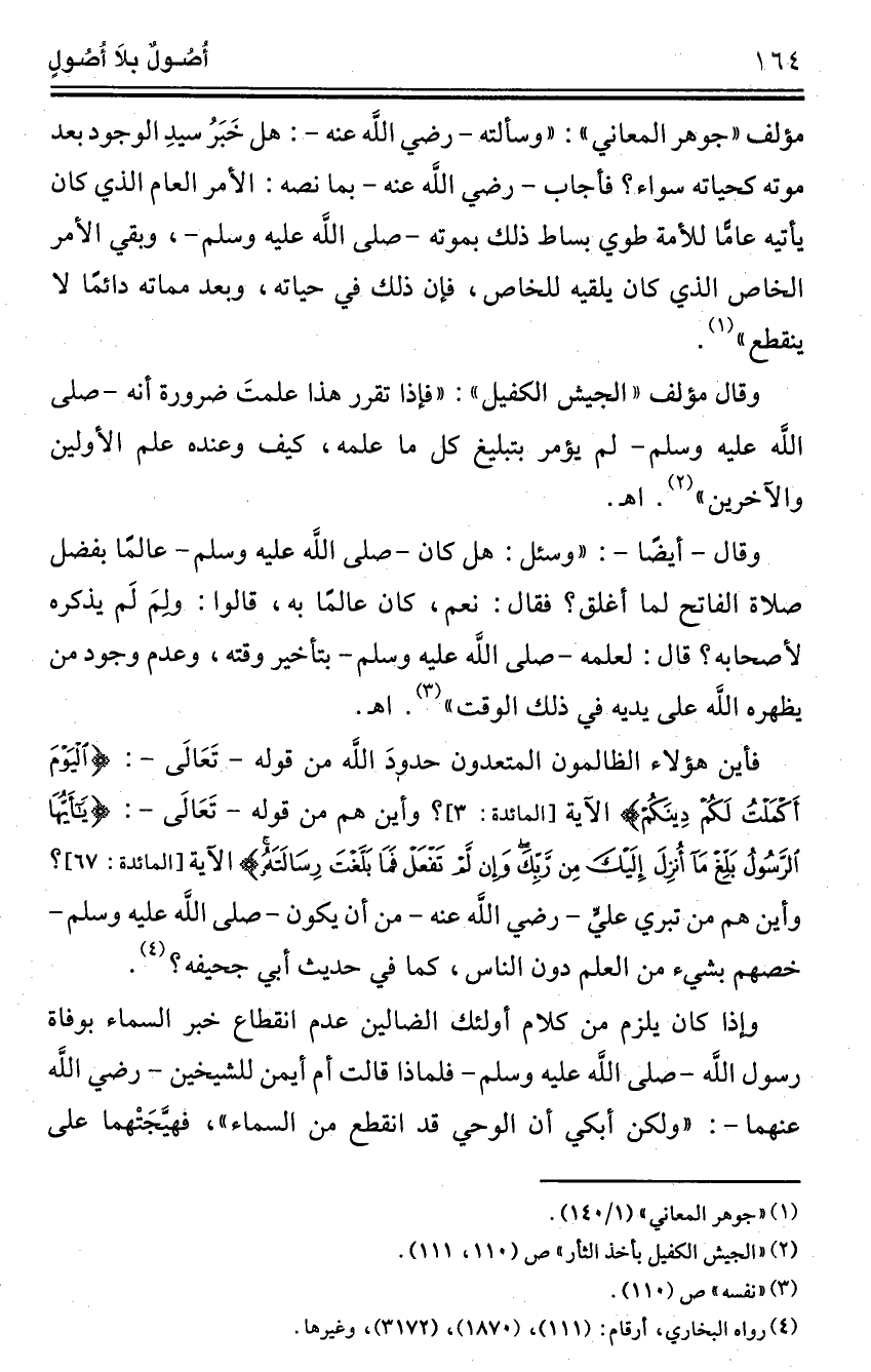 فأين هؤلاء الظالمون المتعدون حدودَ اللَّه من قوله -تَعَالَى-: {الْيَوْمَ أَكْمَلْتُ لَكُمْ دِينَكُمْ} الآية [المائدة: 3]؟ وأين هم من قوله -تَعَالَى-: {يَا أَيُّهَا الرَّسُولُ بَلِّغْ مَا أُنْزِلَ إِلَيْكَ مِنْ رَبِّكَ وَإِنْ لَمْ تَفْعَلْ فَمَا بَلَّغْتَ رِسَالَتَهُ} الآية [المائدة: 67]؟ وأين هم من تبري عليٍّ -رضي الله عنه- من أن يكون -صلى اللَّه عليه وسلم- خصهم بشيء من العلم دون الناس، كما في حديث أبي جحيفه؟ (¬4).