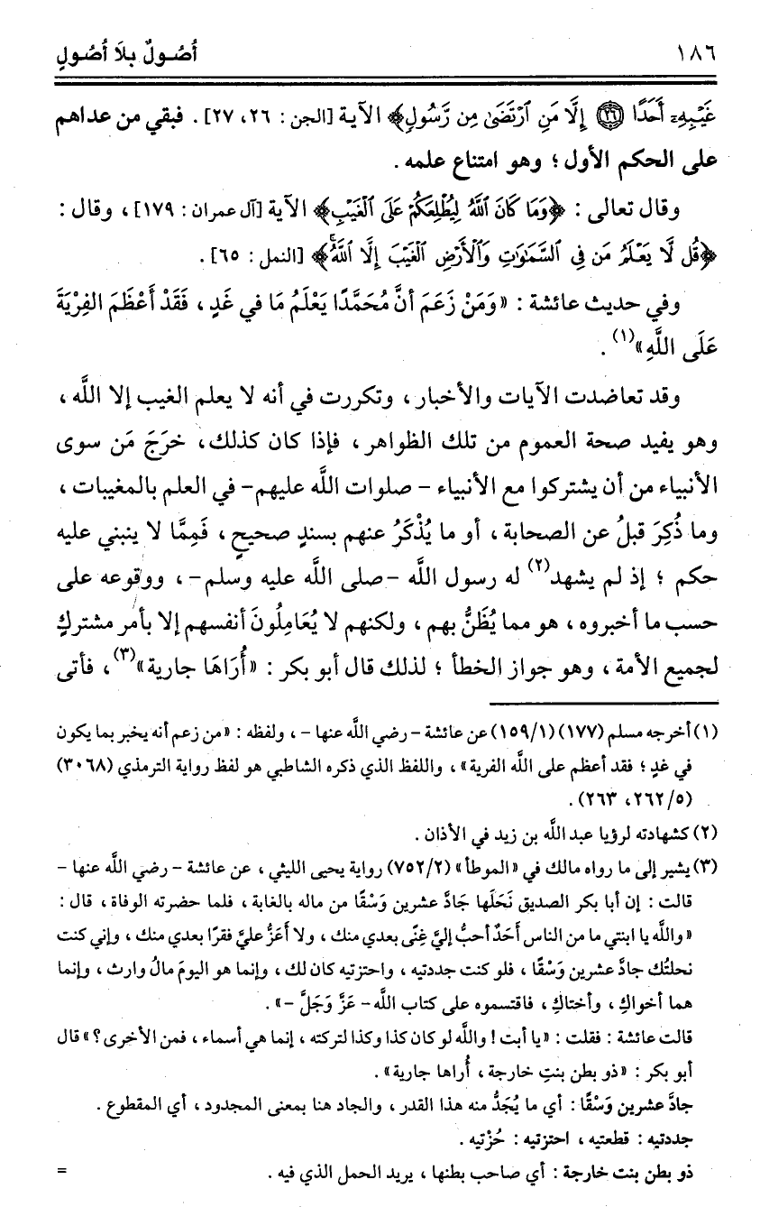 وقد تعاضدت الآيات والأخبار، وتكررت في أنه لا يعلم الغيب إلا الله، وهو يفيد صحة العموم من تلك الظواهر، فإذا كان كذلك، خرَجَ مَن سوى الأنبياء من أن يشتركوا مع الأنبياء -صلوات الله عليهم- في العلم بالمغيبات، وما ذُكِرَ قبلُ عن الصحابة، أو ما يُذْكَرُ عنهم بسندٍ صحيحٍ، فَمِمَّا لا ينبني عليه حكم؛ إذ لم يشهد (¬2) له رسول الله -صلى الله عليه وسلم-، ووقوعه على حسب ما أخبروه، هو مما يُظَنُّ بهم، ولكنهم لا يُعَامِلُونَ أنفسهم إلا بأمر مشتركٍ لجميع الأمة، وهو جواز الخطأ؛ لذلك قال أبو بكر: "أُرَاهَا جارية" (¬3)، فأتى