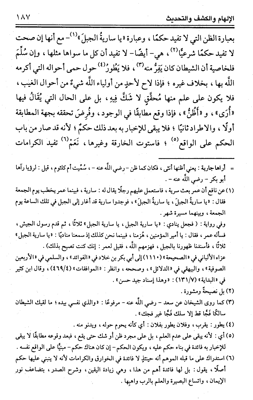 بعبارة الظن التي لا تفيد حكمًا، وعبارة "يا ساريةُ الجبلَ" (¬1) - مع أنها إن صحت لا تفيد حكمًا شرعيًّا (¬2)، هي -أيضًا- لا تفيد أن كل ما سواها مثلها، وإن سُلِّمَ فلخاصية أن الشيطان كان يَفِرُّ منه (¬3)، فلا يَطُورُ (¬4) حول حمى أحواله التي أكرمه الله بها، بخلاف غيره؛ فإذا لاح لأحدٍ من أولياء الله شيءٌ من أحوال الغيب، فلا يكون على علم منها مُحقَّقٍ لا شَكَّ فِيهِ، بل على الحال التي يُقَالُ فيها "أُرَى"، و "أَظُنُّ"، فإذا وقع مطابقًا في الوجود، وفُرِضَ تحققه بجهة المطابقة أولًا، والاطراد ثانيًا؛ فلا يبقى للإخبار به بعد ذلك حكمٌ؛ لأنه قد صار من باب الحكم على الواقع (¬5)؛ فاستوت الخارقة وغيرها، نَعَمْ (¬6) تفيد الكرامات