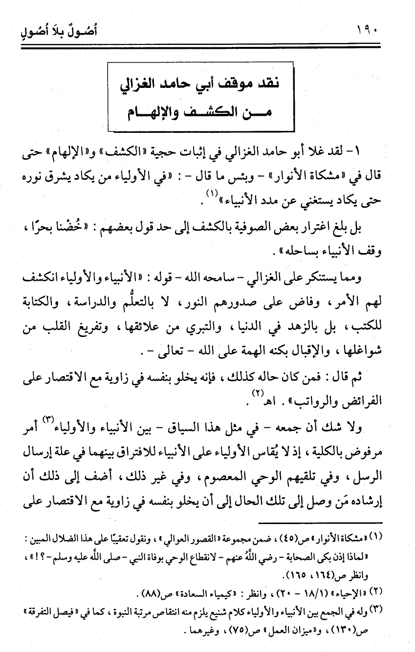 1 - لقد غلا أبو حامد الغزالي في إثبات حجية "الكشف" و"الإلهام" حتى قال في "مشكاة الأنوار" -وبئس ما قال-: "فى الأولياء من يكاد يشرق نوره حتى يكاد يستغني عن مدد الأنبياء" (¬1).