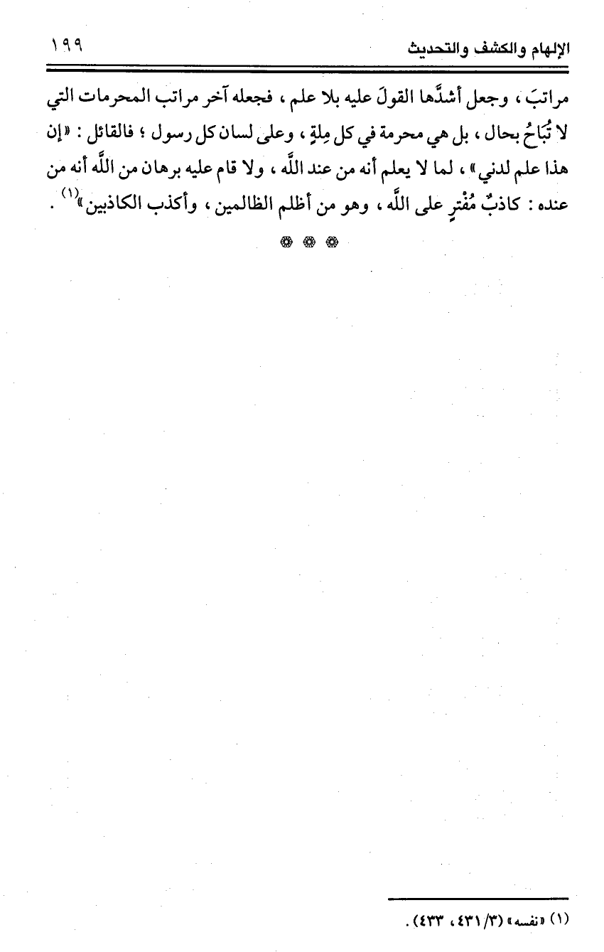مراتبَ، وجعل أشدَّها القولَ عليه بلا علم، فجعله آخر مراتب المحرمات التي لا تبُاحُ بحال، بل هي محرمة في كل مِلةٍ، وعلى لسان كل رسول؛ فالقائل: "إن هذا علم لدني"، لما لا يعلم أنه من عند الله، ولا قام عليه برهان من اللَّه أنه من عنده: كاذبٌ مُفْترٍ على الله، وهو من أظلم الظالمين، وأكذب الكاذبين" (¬1).