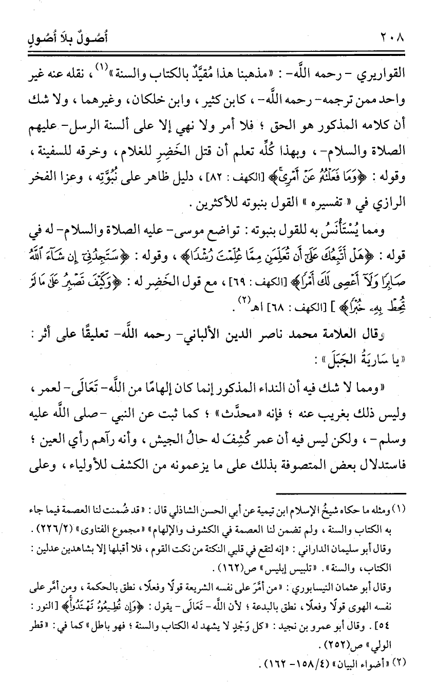 (¬1) ومثله ما حكاه شيخُ الإسلام ابن تيمية عن أبي الحسن الشاذلي قال: "قد ضُمنت لنا العصمة فيما جاء به الكتاب والسنة، ولم تضمن لنا العصمة في الكشوف والإلهام" "مجموع الفتاوى" (2/ 226).
