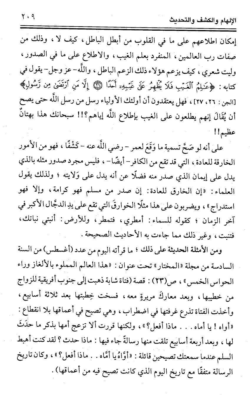 إمكان اطلاعهم على ما في القلوب من أبطل الباطل، كيف لا، وذلك من صفات رب العالمين، المنفرد بعلم الغيب، والاطلاع على ما في الصدور، وليت شعري، كيف يزعم هؤلاء ذلك الزعم الباطل، واللَّه -عز وجل- يقول في كتابه: {عَالِمُ الْغَيْبِ فَلَا يُظْهِرُ عَلَى غَيْبِهِ أَحَدًا (26) إِلَّا مَنِ ارْتَضَى مِنْ رَسُولٍ} [الجن: 26، 27]، فهل يعتقدون أن أولئك الأولياء رسل من رسل اللَّه حتى يصح أن يُقَالَ إنهم يطلعون على الغيب بإطلاع الله إياهم؟!! سبحانك هذا بهتانٌ عظيم!!