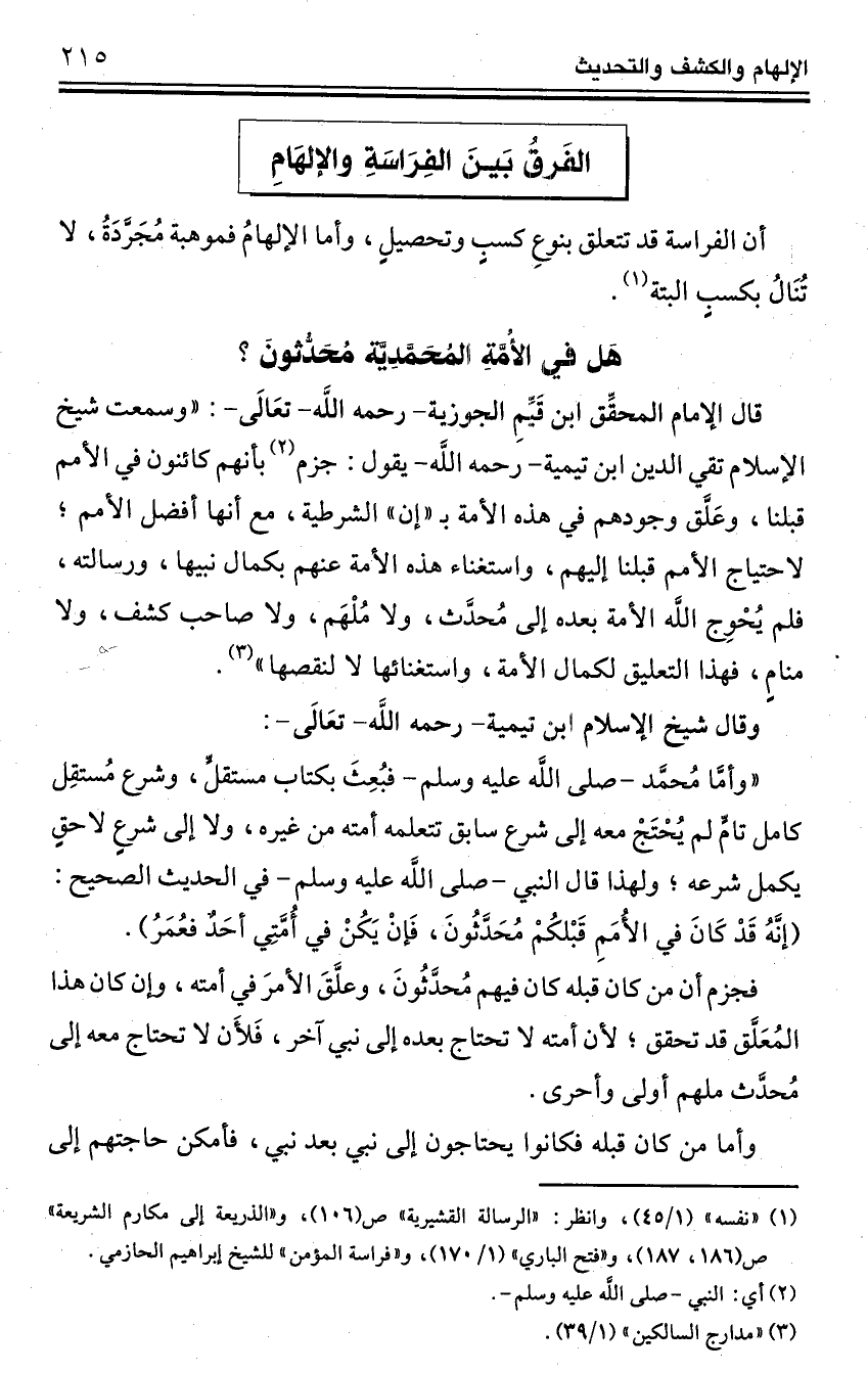 قال الإمام المحقِّق ابن قَيِّمِ الجوزية -رحمه اللَّه - تعَالَى-: "وسمعت شيخ الإسلام تقي الدين ابن تيمية -رحمه اللَّه- يقول: جزم (¬2) بأنهم كائنون في الأمم قبلنا، وعَلَّق وجودهم في هذه الأمة بـ "إن" الشرطية، مع أنها أفضل الأمم؛ لاحتياج الأمم قبلنا إليهم، واستغناء هذه الأمة عنهم بكمال نبيها، ورسالته، فلم يُحْوِج الله الأمة بعده إلى مُحدَّث، ولا مُلْهَم، ولا صاحب كشف، ولا منامٍ، فهذا التعليق لكمال الأمة، واستغنائها لا لنقصها" (¬3).