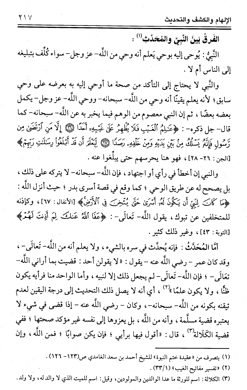 أمَّا المُحَدَّثُ: فإنه يُحدَّث في سره بالشيء، ولا يعلم أنه من الله -تَعالَى-، وقد كان عمر -رضي اللَّه عنه- يقول: "لا يقولن أحد: قضيت بما أراني اللَّه -تعَالَى-؛ فإن اللَّه -تَعالَى- لم يجعل ذلك إلا لنبيه، وأما الواحد منا فرأيه يكون ظنًّا، ولا يكون علمًا" (¬2)، أي أنه لا يصل ذلك التحديث إلى درجة اليقين لعدم تيقنه بكونه من اللَّه -سبحانه-، وكان -رضي اللَّه عنه- إذا قضى في شيء لا يعتبره قضية مُسلَّمة، وأنه من اللَّه، بل يعزوها إلى نفسه غير مؤكد صحتها؛ ففي قضية الكَلَالة (¬3)، قال: "أقول فيها برأيي؛ فإن يكن صوابًا؛ فمن الله، وإن
