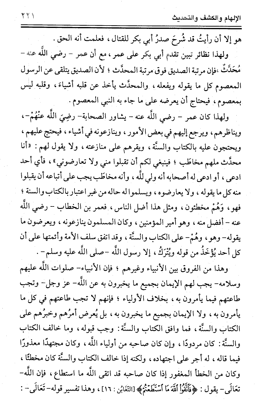 ولهذا كان عمر -رضي اللَّه عنه- يشاور الصحابة -رضِيَ اللَّه عنْهُمْ-، ويناظرهم، ويرجع إليهم في بعض الأمور، وينازعونه في أشياء، فيحتج عليهم، ويحتجون عليه بالكتاب والسنَّة، ويقرهم على منازعته، ولا يقول لهم: "أنا محدَّث ملهم مخاطَب؛ فينبغي لكم أن تقبلوا مني ولا تعارضوني"، فأي أحد ادعى، أو ادعى له أصحابه أنه ولي للَّه، وأنه مخاطَب يجب على أتباعه أن يقبلوا منه كل ما يقوله، ولا يعارضوه، ويسلموا له حاله من غير اعتبار بالكتاب والسنة؛ فهو، وَهُمْ مخطئون، ومثل هذا أضل الناس، فعمر بن الخطاب -رضي الله عنه- أفضل منه، وهو أمير المؤمنين، وكان المسلمون ينازعونه، ويعرضون ما يقوله -وهو، وهُمْ- على الكتاب والسنَّة، وقد اتفق سلف الأمة وأئمتها على أن كل أحد يُؤْخَذُ من قوله ويُتْرَكُ، إلا رسول اللَّه -صلى اللَّه عليه وسلم-.