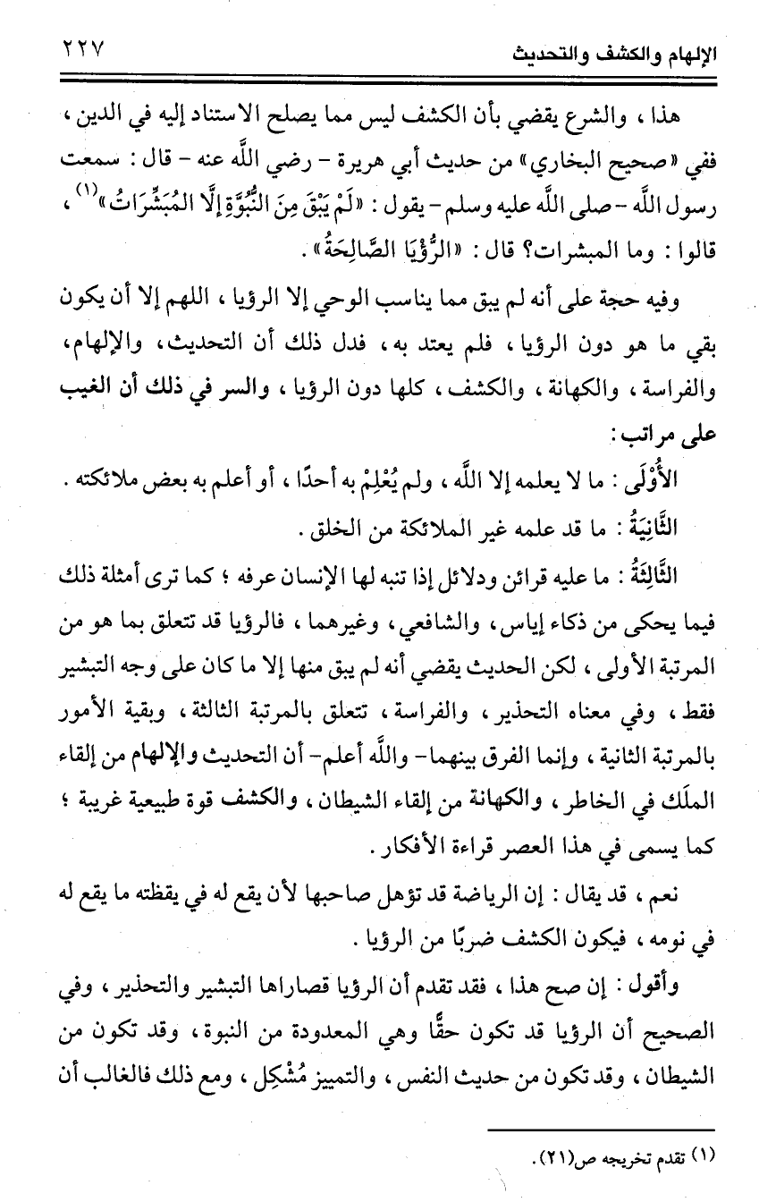 الثَّالِثَةُ: ما عليه قرائن ودلائل إذا تنبه لها الإنسان عرفه؛ كما ترى أمثلة ذلك فيما يحكى من ذكاء إياس، والشافعي، وغيرهما، فالرؤيا قد تتعلق بما هو من المرتبة الأولى، لكن الحديث يقضي أنه لم يبق منها إلا ما كان على وجه التبشير فقط، وفي معناه التحذير، والفراسة، تتعلق بالمرتبة الثالثة، وبقية الأمور بالمرتبة الثانية، وإنما الفرق بينهما -واللَّه أعلم- أن التحديث والإلهام من إلقاء الملَك في الخاطر، والكهانة من إلقاء الشيطان، والكشف قوة طبيعية غريبة؛ كما يسمى في هذا العصر قراءة الأفكار.