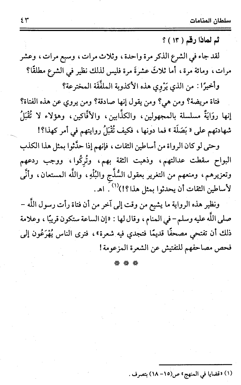 لقد جاء في الشرع الذكر مرة واحدة، وثلاث مرات، وسبع مرات، وعشر مرات، ومائة مرة، أما ثلاثَ عشرةَ مرة فليس لذلك نظير في الشرع مطلقًا؟