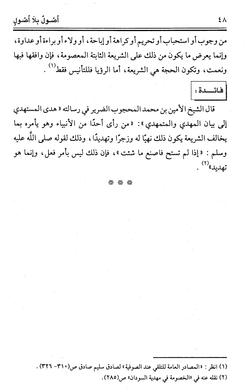 من وجوب أو استحباب أو تحريم أو كراهة أوإباحة، أو ولاء أو براءة أو عداوة، وإنما يعرض ما يكون من ذلك على الشريعة الثابتة المعصومة، فإن وافقها فبها ونعمت، وتكون الحجة هي الشريعة، أما الرؤيا فللتأنيس فقط (¬1).