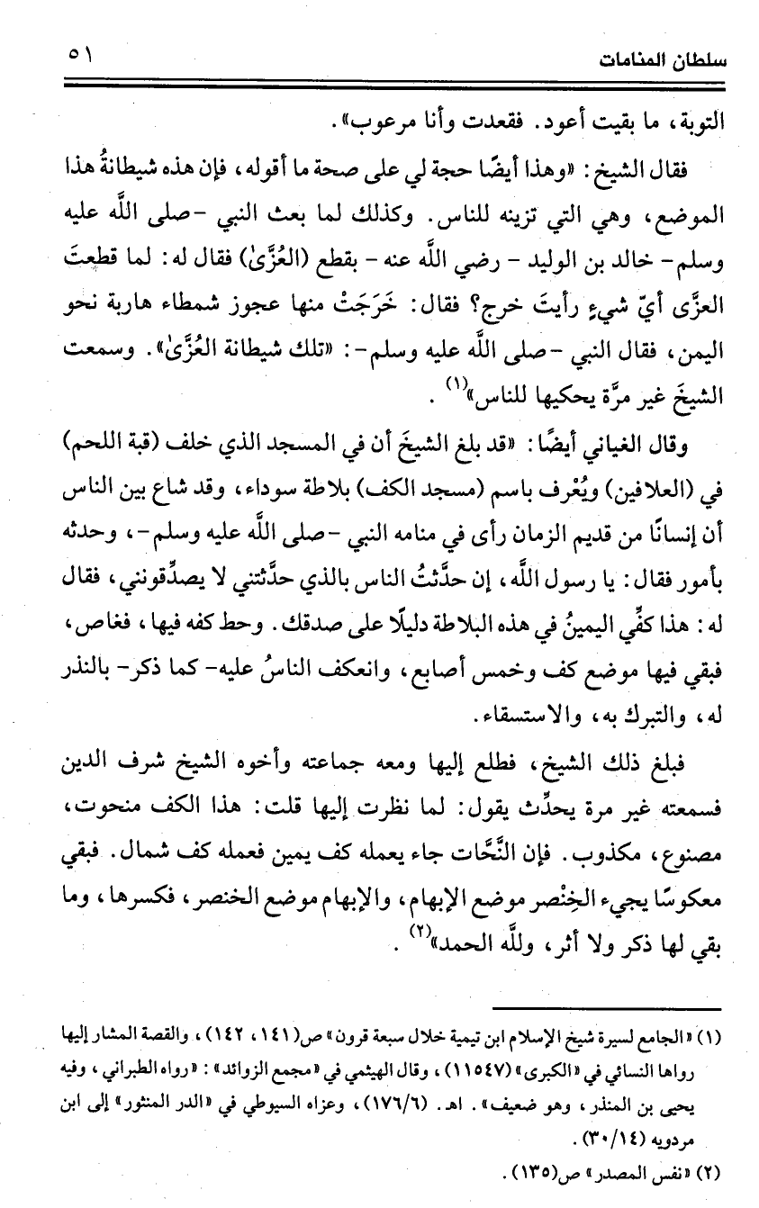 فقال الشيخ: "وهذا أيضًا حجة لي على صحة ما أقوله، فإن هذه شيطانةُ هذا الموضع، وهي التي تزينه للناس. وكذلك لما بعث النبي -صلى اللَّه عليه وسلم- خالد بن الوليد -رضي اللَّه عنه- بقطع (العُزَّى) فقال له: لما قطعتَ العزى أيّ شيءٍ رأيتَ خرج؟ فقال: خَرَجَتْ منها عجوز شمطاء هاربة نحو اليمن، فقال النبي -صلى اللَّه عليه وسلم-: "تلك شيطانة العُزَّى". وسمعت الشيخَ غير مرَّة يحكيها للناس" (¬1).