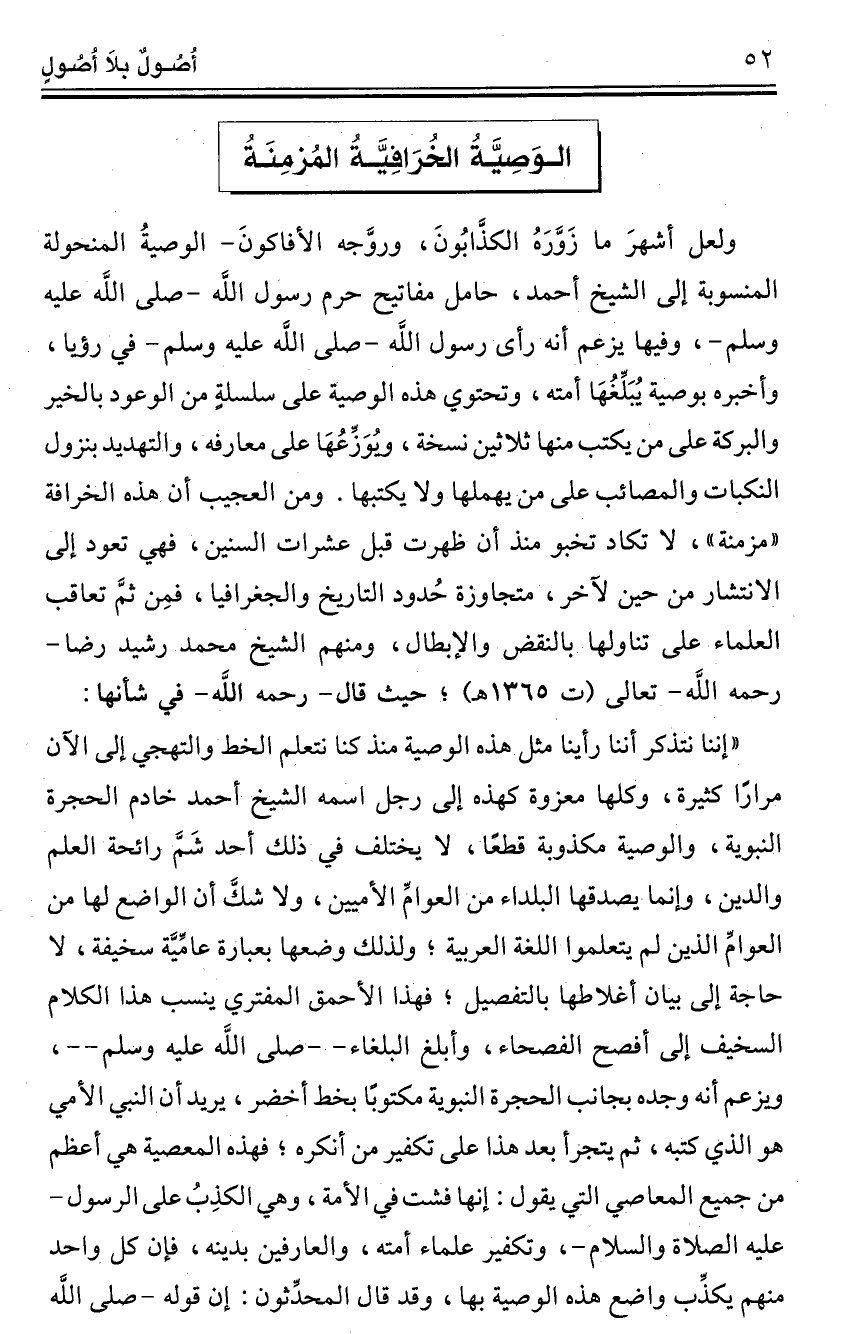 "إننا نتذكر أننا رأينا مثل هذه الوصية منذ كنا نتعلم الخط والتهجي إلى الآن مرارًا كثيرة، وكلها معزوة كهذه إلى رجل اسمه الشيخ أحمد خادم الحجرة النبوية، والوصية مكذوبة قطعًا، لا يختلف في ذلك أحد شَمَّ رائحة العلم والدين، وإنما يصدقها البلداء من العوامِّ الأميين، ولا شك أن الواضع لها من العوامِّ الذين لم يتعلموا اللغة العربية؛ ولذلك وضعها بعبارة عامِّيَّة سخيفة، لا حاجة إلى بيان أغلاطها بالتفصيل؛ فهذا الأحمق المفتري ينسب هذا الكلام السخيف إلى أفصح الفصحاء، وأبلغ البلغاء -صلى اللَّه عليه وسلم-، ويزعم أنه وجده بجانب الحجرة النبوية مكتوبًا بخط أخضر، يريد أن النبي الأمي هو الذي كتبه، ثم يتجرأ بعد هذا على تكفير من أنكره؛ فهذه المعصية هي أعظم من جميع المعاصي التي يقول: إنها فشت في الأمة، وهي الكذِبُ على الرسول -عليه الصلاة والسلام-، وتكفير علماء أمته، والعارفين بدينه، فإن كل واحد منهم يكذِّب واضع هذه الوصية بها، وقد قال المحدِّثون: إن قوله -صلى الله