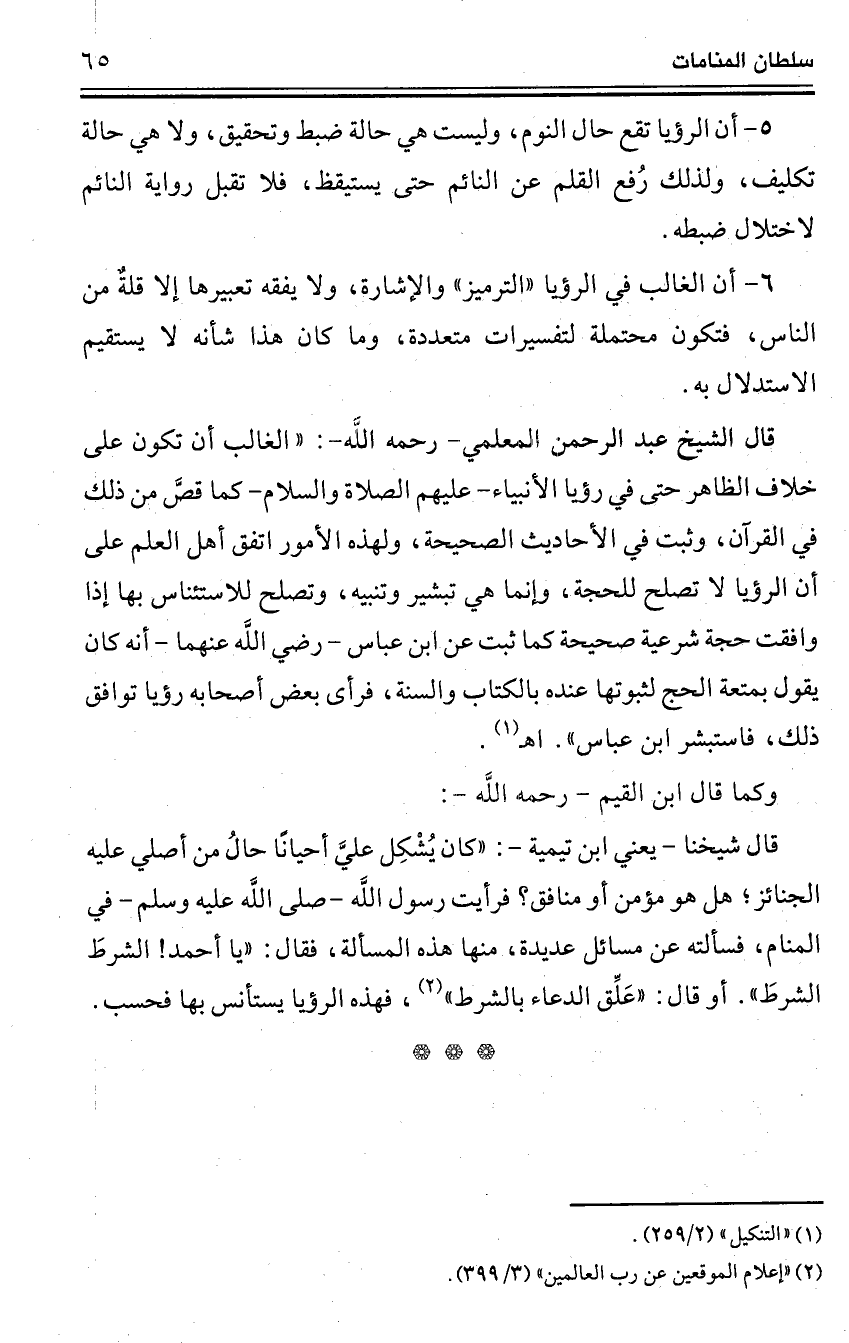 قال الشيخ عبد الرحمن المعلمي -رحمه الله-: "الغالب أن تكون على خلاف الظاهر حتى في رؤيا الأنبياء -عليهم الصلاة والسلام- كما قصَّ من ذلك في القرآن، وثبت في الأحاديث الصحيحة، ولهذه الأمور اتفق أهل العلم على أن الرؤيا لا تصلح للحجة، وإنما هي تبشير وتنبيه، وتصلح للاستئناس بها إذا وافقت حجة شرعية صحيحة كما ثبت عن ابن عباس -رضي اللَّه عنهما- أنه كان يقول بمتعة الحج لثبوتها عنده بالكتاب والسنة، فرأى بعض أصحابه رؤيا توافق ذلك، فاستبشر ابن عباس". اهـ (¬1).