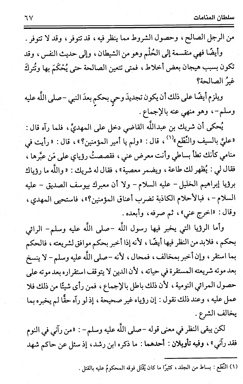 وأيضًا فهي منقسمة إلى الحُلْم وهو من الشيطان، وإلى حديث النفس، وقد تكون بسبب هيجان بعض أخلاط، فمتى تتعين الصالحة حتى يُحْكَمَ بها وتُتركَ غيرُ الصالحة؟