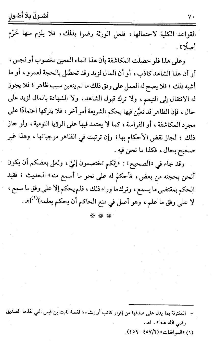 وعلى هذا فلو حصلت المكاشفة بأن هذا الماء المعين مغصوب أو نجس، أو أن هذا الشاهد كاذب، أو أن المال لزيد وقد تحصَّل بالحجة لعمرو، أو ما أشبه ذلك؛ فلا يصح له العمل على وفق ذلك ما لم يتعين سبب ظاهر؛ فلا يجوز له الانتقال إلى التيمم، ولا ترك قبول الشاهد، ولا الشهادة بالمال لزيد على حال، فإن الظاهر قد تعيَّن فيها بحكم الشريعة أمر آخر، فلا يتركها اعتمادًا على مجرد المكاشفة، أو الفراسة، كما لا يعتمد فيها على الرؤيا النومية، ولو جاز ذلك؛ لجاز نقض الأحكام بها؛ وإن ترتبت في الظاهر موجباتها، وهذا غير صحيح بحال، فكذا ما نحن فيه.