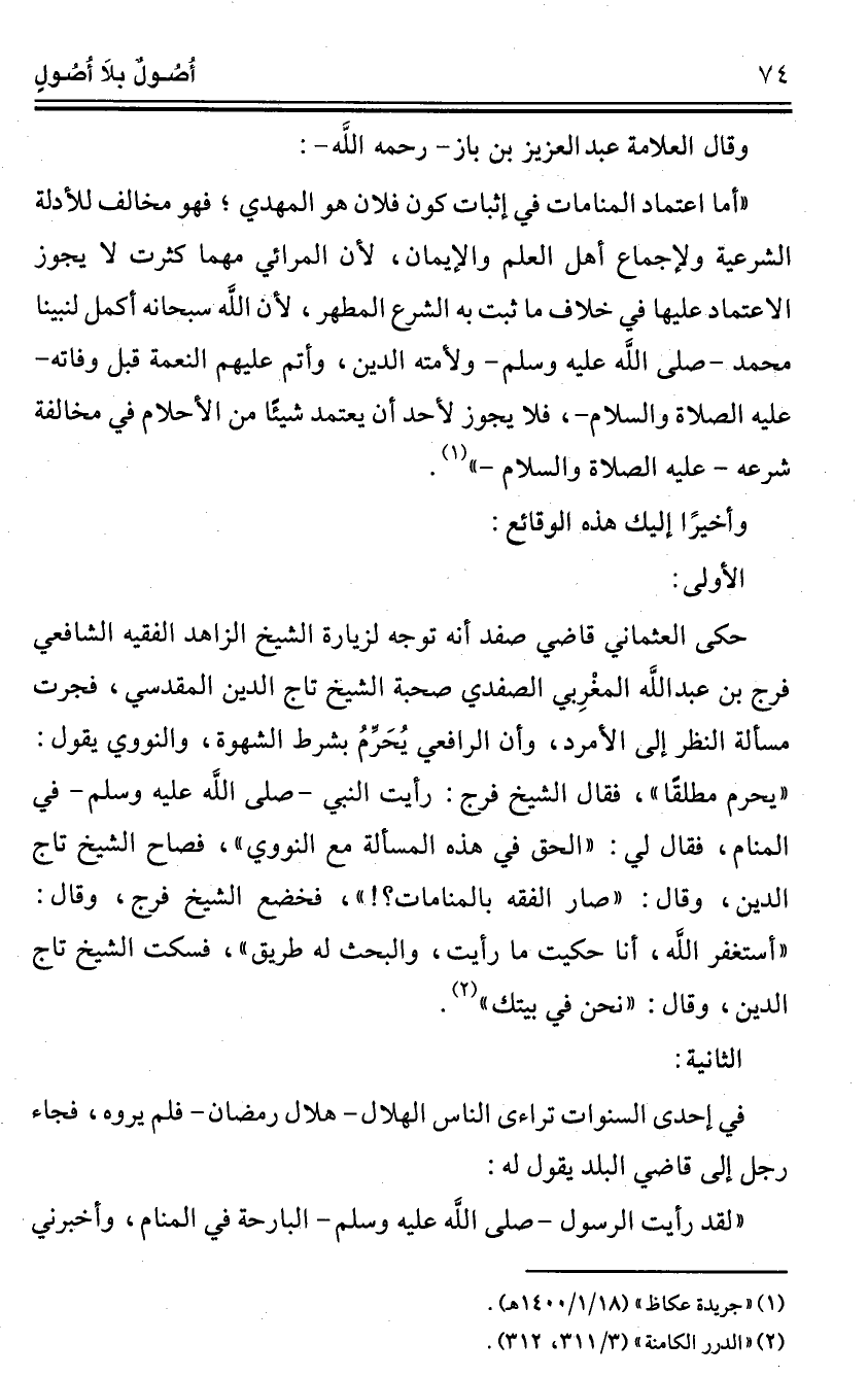 "أما اعتماد المنامات في إثبات كون فلان هو المهدي؛ فهو مخالف للأدلة الشرعية ولإجماع أهل العلم والإيمان، لأن المرائي مهما كثرت لا يجوز الاعتماد عليها في خلاف ما ثبت به الشرع المطهر، لأن الله سبحانه أكمل لنبينا محمد -صلى اللَّه عليه وسلم- ولأمته الدين، وأتم عليهم النعمة قبل وفاته -عليه الصلاة والسلام-، فلا يجوز لأحد أن يعتمد شيئًا من الأحلام في مخالفة شرعه -عليه الصلاة والسلام-" (¬1).
