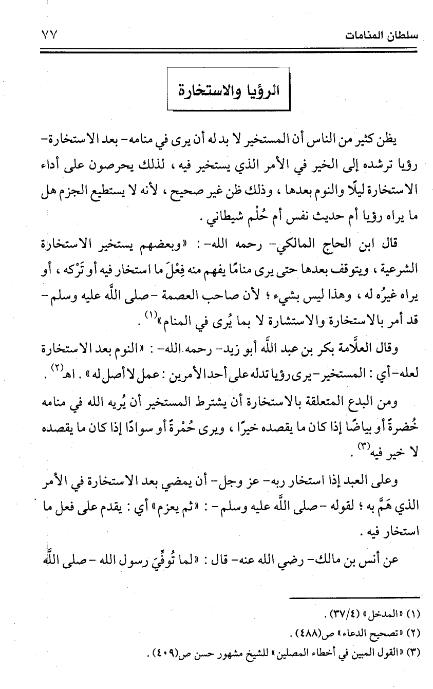 قال ابن الحاج المالكي -رحمه الله-: "وبعضهم يستخير الاستخارة الشرعية، ويتوقف بعدها حتى يرى منامًا يفهم منه فِعْلَ ما استخار فيه أو تَرْكه، أو يراه غيرُه له، وهذا ليس بشيء؛ لأن صاحب العصمة -صلى اللَّه عليه وسلم- قد أمر بالاستخارة والاستشارة لا بما يُرى في المنام" (¬1).