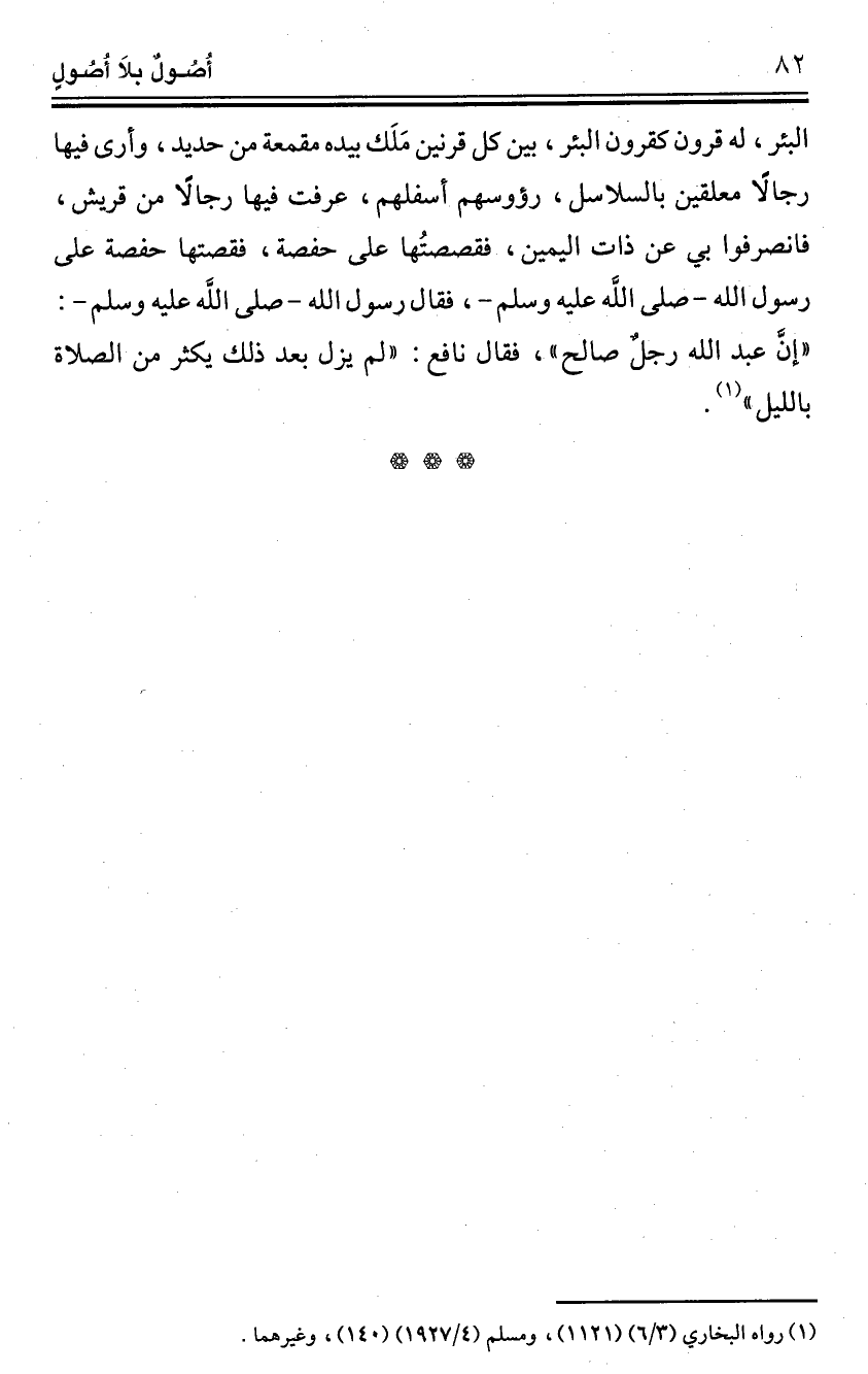 البئر، له قرون كقرون البئر، بين كل قرنين مَلَك بيده مقمعة من حديد، وأرى فيها رجالًا معلقين بالسلاسل، رؤوسهم أسفلهم، عرفت فيها رجالًا من قريش، فانصرفوا بي عن ذات اليمين، فقصصتُها على حفصة، فقصتها حفصة على رسول الله -صلى اللَّه عليه وسلم-، فقال رسول الله -صلى اللَّه عليه وسلم-: "إنَّ عبد الله رجل صالح"، فقال نافع: "لم يزل بعد ذلك يكثر من الصلاة بالليل" (¬1).