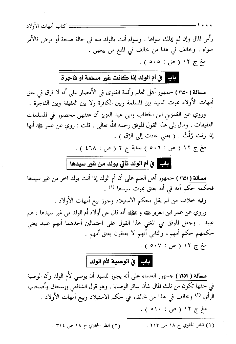 مسألة (1650) جمهور أهل العلم وأئمة الفتوى في الأمصار على أنه لا فرق في عتق أمهات الأولاد بموت السيد بين المسلمة وبين الكافرة ولا بين العفيفة وبين الفاجرة.