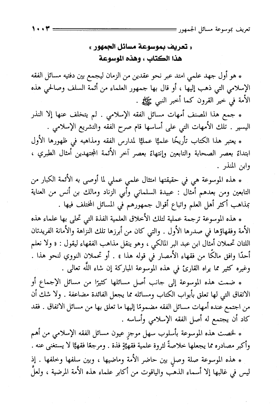 * هو أول جهد علمي امتد عبر نحو عقدين من الزمان ليجمع بين دفتيه مسائل الفقه الإِسلامىِ التي ذهب إليها، أو قال بها جمهور العلماء من أئمة السلف وصالحي هذه الأمة في خير القرون كما أخبر النبي - صلى الله عليه وسلم -.