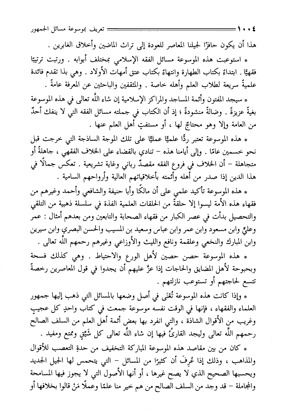* سيجد المفتون وأئمة المساجد والمراكز الإسلامية إن شاء الله تعالى في هذه الموسوعة بغيةً عزيزةً. وضالةً منشودةً؛ إذ أن الكتاب في جملته مسائل الفقه التي لا ينفك أحدٌ من العامة وإلا وهو محتاجٌ لها، أو مستفتٍ أهل العلم عنها.