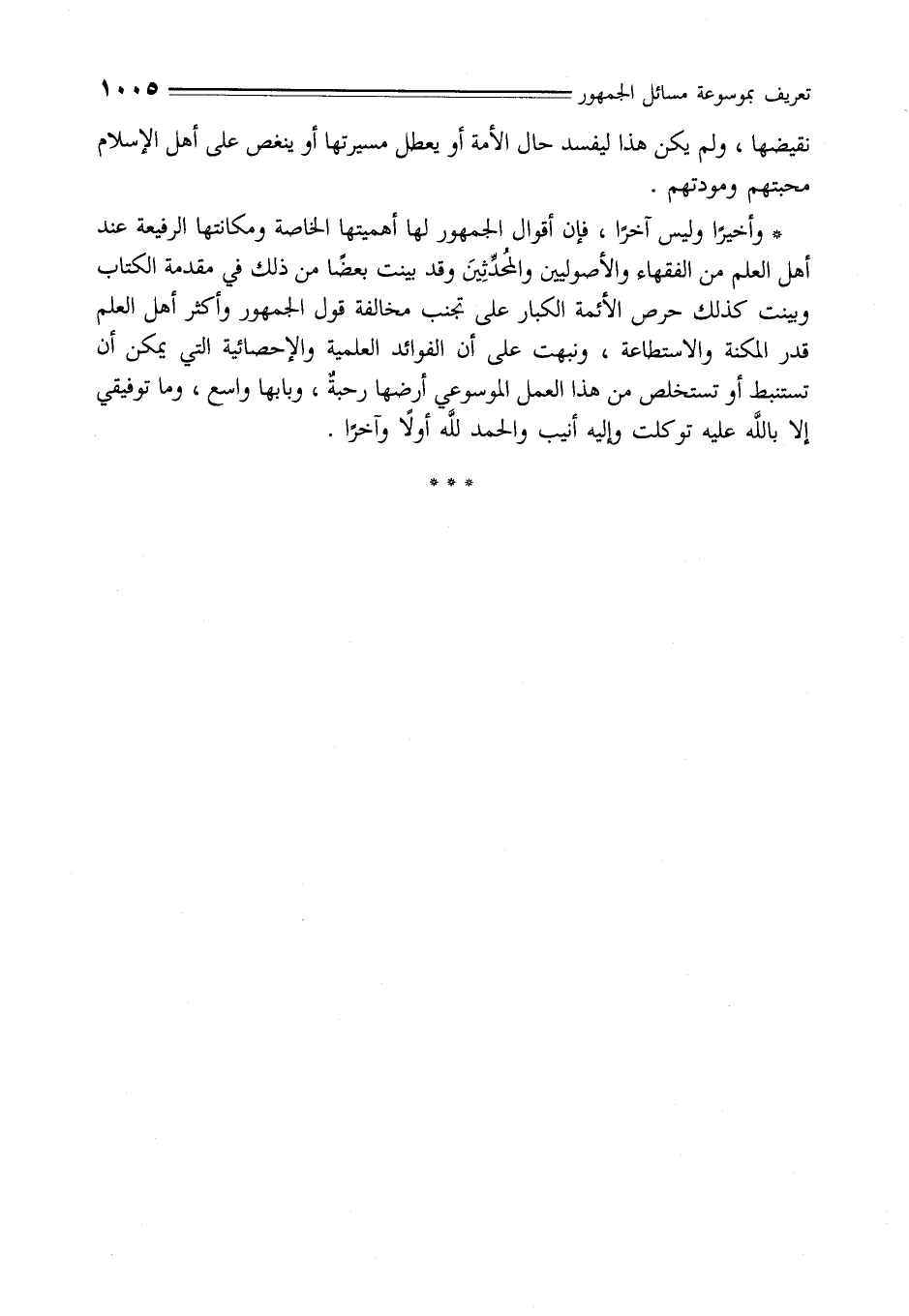 * وأخيرًا وليس آخرًا، فإن أقوال الجمهور لها أهميتها الخاصة ومكانتها الرفيعة عند أهل العلم من الفقهاء والأصولين والمُحدِّثِينَ وقد بينت بعضًا من ذلك في مقدمة الكتاب وبينت كذلك حرص الأئمة الكبار على تجنب مخالفة قول الجمهور وأكثر أهل العلم قدر المكنة والاستطاعة، ونبهت على أن الفوائد العلمية والإحصائية التي يمكن أن تستنبط أو تستخلص من هذا العمل الموسوعىِ أرضها رحبةٌ، وبابها واسع، وما توفيقي إلا بالله عليه توكلت وإليه أنيب والحمد لله أولًا وآخرًا.